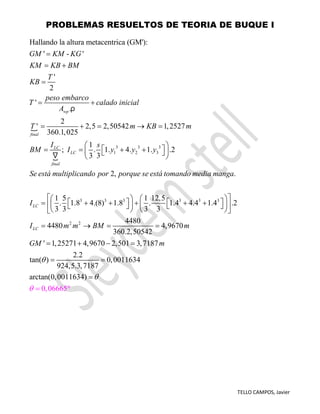 Este documento presenta la resolución de un problema de teoría de buque. Se trata de calcular la escora producida por el embarque de 2 toneladas a 2 metros de crujía en un flotador de 35 x 16 metros a un calado de 2.5 metros. Los cálculos muestran que este embarque produce una escora de 0.066 grados o 0.066°.