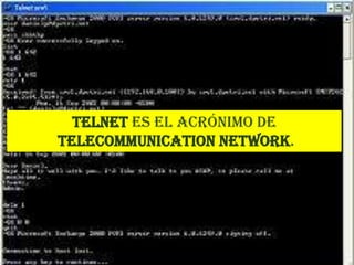Telnet es un protocolo que permite acceder y controlar una computadora de forma remota. La información transmitida no está cifrada, por lo que puede ser interceptada. Es recomendable usar SSH o SSL en su lugar, ya que ofrecen cifrado. Para conectarse a una máquina remota se requiere una cuenta de acceso otorgada por el administrador, la cual define permisos y condiciones de uso.