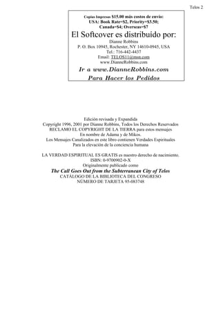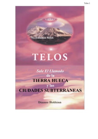 Este documento presenta información sobre la ciudad subterránea de Telos. Telos se encuentra debajo del Monte Shasta en California y fue fundada por los lemurianos. Los lemurianos viven ahora en paz y armonía en Telos, donde han creado una avanzada civilización con tecnología avanzada. El líder de Telos, Adama, ofrece un mensaje de bienvenida y comparte detalles sobre la historia y estilo de vida lemurianos en Telos.