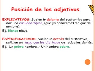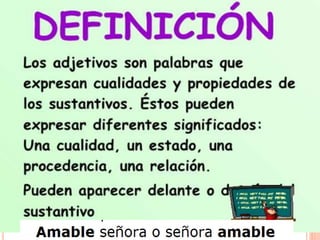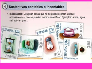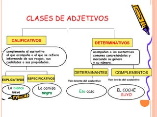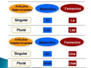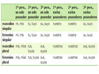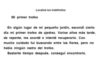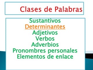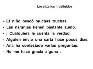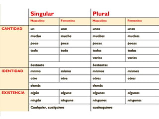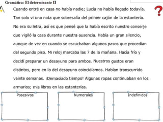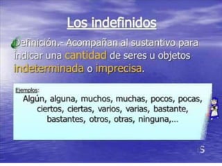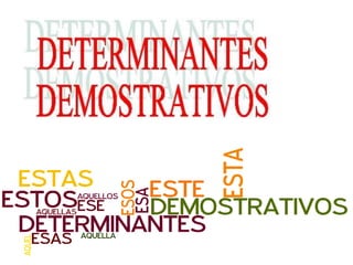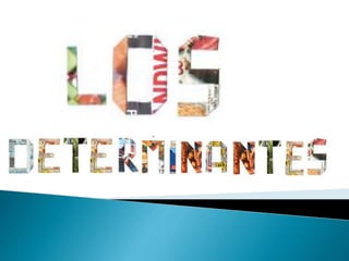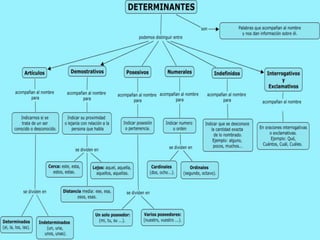 Este documento define y explica los diferentes tipos de determinantes, incluyendo artículos, posesivos, demostrativos, numerales e indefinidos. Los determinantes preceden al nombre y lo concretan, indicando características como género, número, posesión o cantidad.