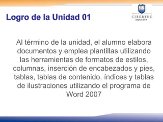 Este documento presenta una introducción al programa Word 2007, incluyendo las novedades, la interfaz gráfica, la edición de documentos y la configuración de páginas. Explica cómo configurar los formatos de fuente y párrafo, y crear listas con viñetas o numeración. El objetivo es que los estudiantes aprendan a utilizar las herramientas básicas de Word 2007 para elaborar documentos.