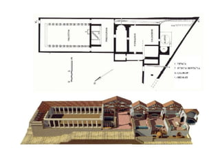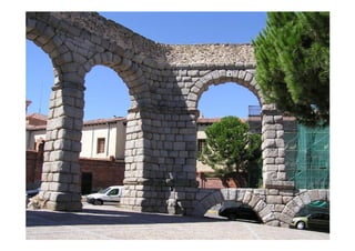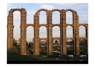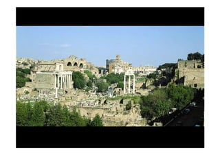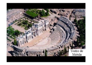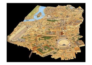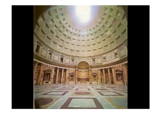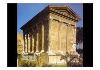Este documento presenta una breve descripción de diferentes aspectos de la arquitectura, el urbanismo, la escultura y el arte romano, incluyendo ejemplos de templos, tumbas, acueductos, puentes, teatros, anfiteatros y más. Se mencionan sitios como el Templo de Belvedere, la necrópolis de Caere, el sarcófago del Obeso, la ciudad de Timgad y monumentos como el Coliseo, el Arco de Adriano y las Termas de Caracalla.