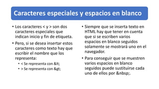 El documento habla sobre dar formato a texto en HTML. Explica caracteres especiales como < y > y cómo representarlos. También cubre alineación de texto usando los atributos "align" en las etiquetas <p> y <div>. Incluye ejemplos de cómo centrar, alinear a la derecha e izquierda. Finalmente, presenta etiquetas de encabezado <h1>-<h6> y otros formatos de texto en HTML.