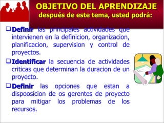 Este documento proporciona información sobre la administración de proyectos. Define conceptos clave como proyecto, programa y partes interesadas. Explica la importancia de definir claramente el alcance y los objetivos de un proyecto al comienzo del mismo para guiar el trabajo y medir el éxito. También describe los tipos de objetivos, como los objetivos generales que enmarcan los alcances globales y los objetivos específicos que definen las acciones concretas a realizar.