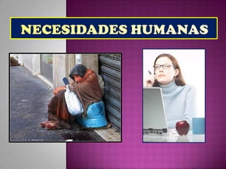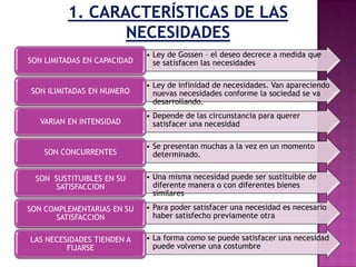 El documento describe las características de las necesidades humanas. Las necesidades son limitadas en capacidad pero ilimitadas en número, y varían en intensidad. Son concurrentes, sustituibles en su satisfacción, y complementarias. Finalmente, tienden a fijarse en patrones de comportamiento.