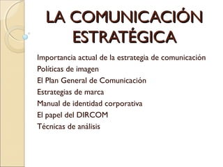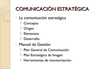 Este documento trata sobre la comunicación estratégica y contiene información sobre su concepto, orígenes, elementos, desarrollo y herramientas. Explica que la comunicación estratégica coordina los recursos comunicativos de una organización para lograr una ventaja competitiva y posicionarse en la mente de los públicos objetivo. También describe manuales y planes de comunicación que guían la estrategia de una organización.