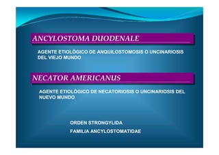 Este documento describe Ancylostoma duodenale y Necator americanus, los parásitos que causan anquilostomiasis o uncinariasis. Describe su morfología, ciclo de vida, epidemiología, patogenia, síntomas, diagnóstico y tratamiento. Estos parásitos viven en el intestino delgado humano y las hembras ponen huevos que son expulsados en las heces. Las larvas eclosionan de los huevos en el suelo y pueden infectar a otros humanos a través de la piel. C