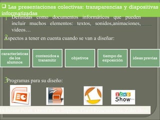 Este documento describe las características de las presentaciones digitales y ofrece consejos para su diseño y presentación efectiva. Explica que las presentaciones pueden incluir texto, sonido, animaciones y video, y recomienda programas como PowerPoint. Además, brinda recomendaciones sobre la estructura, tipo de letra, títulos y redacción. Finalmente, ofrece pautas para una presentación oral enérgica y enfocada en el público.