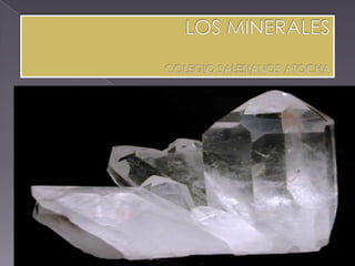 El documento describe los minerales, sus propiedades y cómo se forman. Los minerales son sólidos inorgánicos con una composición química y estructura fija que se encuentran de forma natural. Se pueden clasificar según sus propiedades como dureza, color, brillo, fractura y transparencia. Los minerales se forman por procesos sedimentarios, ígneos o metamórficos.