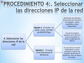 Este documento presenta 12 procedimientos para configurar una red local desde cero, incluyendo la selección y configuración de dispositivos de red, la instalación de tarjetas de red, la asignación de direcciones IP, y medidas para administrar y proteger la red. Explica conceptos básicos de redes como arquitecturas, medios de transmisión y componentes de red. El objetivo es proporcionar una guía paso a paso para establecer una red funcional de área local en el hogar o pequeña oficina.