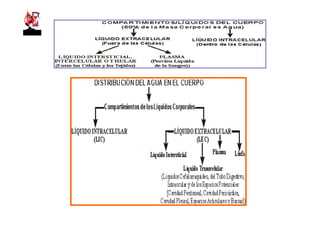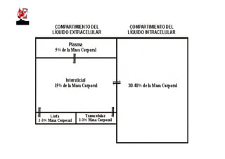 Este documento presenta información sobre el medio interno, incluyendo su definición, composición de los diferentes compartimentos líquidos como el plasma sanguíneo y los líquidos extracelular e intracelular, y métodos para medir los volúmenes de sangre y líquidos. También discute conceptos clave como la homeostasis y la regulación del volumen sanguíneo.