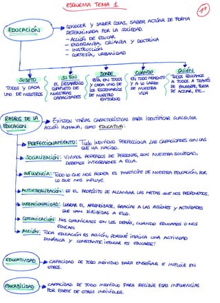 Este documento resume brevemente tres aspectos clave de la educación: 1) La educación busca desarrollar las capacidades de cada individuo. 2) Se lleva a cabo de manera continua a lo largo de la vida mediante diversas instituciones y experiencias. 3) Tiene como objetivo enseñar conocimientos y valores que permitan a las personas interactuar en sociedad de manera constructiva.