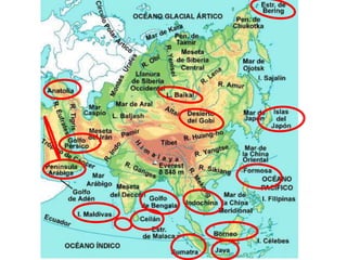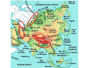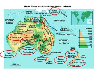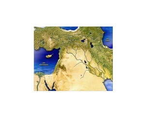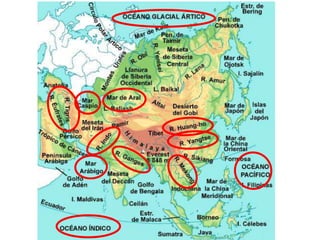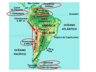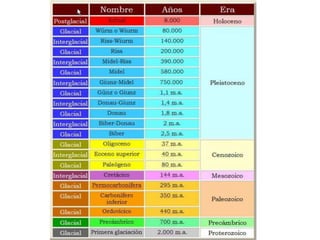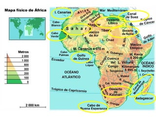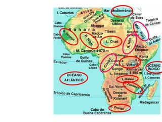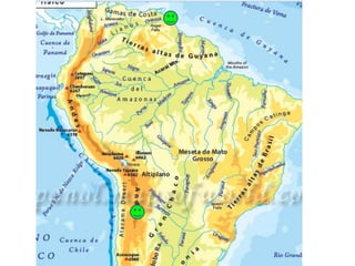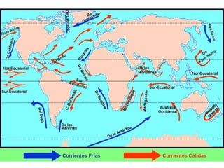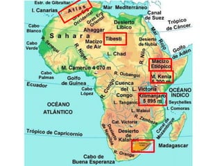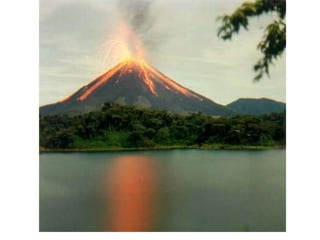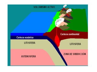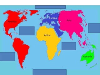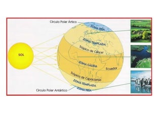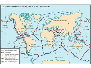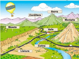 El documento describe la división de la Tierra en placas tectónicas y cómo su movimiento causa fenómenos como volcanes y terremotos. También explica las diferentes formas del relieve terrestre como montañas, colinas, mesetas y llanuras. Finalmente, discute cómo el agua es fundamental para la vida humana y cómo las civilizaciones antiguas se establecieron cerca de ríos.