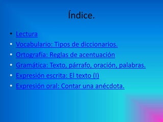 Este documento presenta el índice de contenidos de un cuaderno escolar para el 5o curso de primaria. Incluye secciones sobre lectura, vocabulario, ortografía, gramática, expresión escrita y expresión oral.