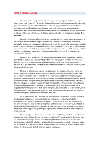 Este documento discute las relaciones entre la ciencia y la música. Explica que la música ha sido considerada como una ciencia (asociada con las matemáticas y la astronomía) desde tiempos antiguos. También destaca las conexiones entre la música y disciplinas como la estética, la física, la historia y las ciencias sociales. Finalmente, introduce la musicología como la ciencia moderna que estudia los fenómenos musicales y su relación con otros campos artísticos y literarios.