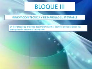 El documento habla sobre el bloque III de tecnología, el cual se enfoca en desarrollar sistemas técnicos que consideren los principios del desarrollo sustentable. El propósito es tomar decisiones para emplear de manera eficiente materiales y energía en los procesos técnicos con el fin de prever riesgos ambientales y sociales. También discute que los sistemas técnicos producen impactos ambientales al usar recursos, y que la sociedad y la industria están tomando más conciencia de la necesidad de cuidar el medio ambiente
