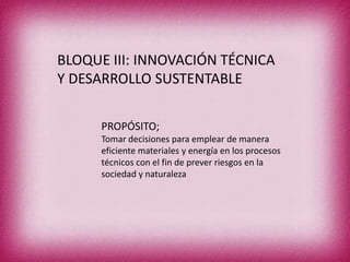 Este documento trata sobre la prospectiva tecnológica y el desarrollo sustentable. Explica que los gobiernos y empresas trabajan juntos para determinar qué tecnologías son más adecuadas para cada país y cómo adquirirlas y desarrollarlas de manera sustentable. También habla sobre proyectos en México como los Centros Nacionales de Producción más Limpia, los cuales ayudan a pequeñas y medianas empresas a producir menos basura y desechos industriales de manera amigable con el medio ambiente.