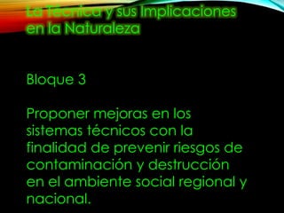 Este documento trata sobre las implicaciones locales, regionales y globales de los sistemas técnicos en la naturaleza. Explora cómo pequeños cambios en la temperatura global pueden tener grandes efectos en el clima local. También discute cómo la contaminación del suelo, agua y aire por desechos, emisiones de vehículos y extracción de recursos naturales amenaza ecosistemas y la salud humana. Finalmente, propone analizar los procesos técnicos para modificar tendencias de deterioro ambiental como la pérdida de biodiversidad y contaminación