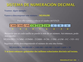 El documento explica el sistema decimal de numeración, donde cada orden de magnitud (unidades, decenas, centenas, etc.) está formado por un múltiplo de 10 del orden inferior. Seguidamente, muestra ejemplos de descomposición de números enteros en sus diferentes órdenes mediante el uso de una tabla. Finalmente, presenta ejercicios de cálculo aplicando el orden de las operaciones.