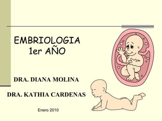 Este documento presenta el programa de estudios de Embriología para estudiantes de primer año de medicina en la Universidad de los Andes. El programa consta de 5 unidades y 50 temas sobre el desarrollo humano normal y anormal desde la concepción hasta el nacimiento. La asignatura será impartida por las Doctoras Diana Molina y Kathia Cárdenas y cubrirá temas como el desarrollo de los sistemas locomotor, cardiovascular, nervioso, digestivo y reproductor, así como malformaciones en dichos sistemas.