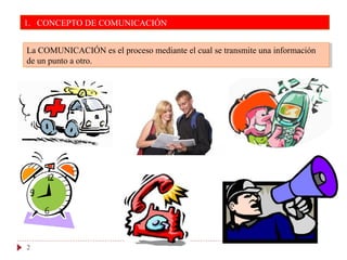 El documento describe los conceptos fundamentales de la comunicación. Define la comunicación como el proceso de transmisión de información de un punto a otro. Explica que la comunicación implica un emisor, mensaje, canal, receptor y código. Además, detalla las diferentes formas de comunicación como la comunicación verbal u oral vs escrita, y la comunicación bilateral vs unilateral. Finalmente, introduce los conceptos básicos de los signos en la comunicación, incluyendo indicios, iconos y símbolos.