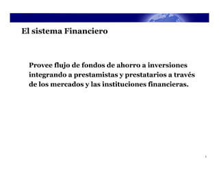 El documento introduce los mercados financieros y sus componentes básicos. Explica que los mercados financieros y las instituciones financieras facilitan la transferencia de fondos de agentes con excedentes (ahorradores) a aquellos con déficit (prestatarios). También describe los tipos principales de intermediarios financieros como bancos comerciales, compañías de seguros y fondos de pensiones, los cuales transforman las obligaciones para proveer servicios a ahorradores y prestatarios.