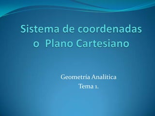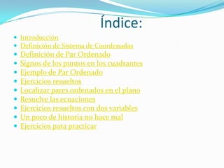 Este documento introduce la geometría analítica y el sistema de coordenadas cartesianas. Explica qué son las abscisas y ordenadas, cómo se definen los cuadrantes y pares ordenados, y cómo localizar puntos en el plano. Incluye ejemplos de ecuaciones y pares ordenados, así como una breve historia del desarrollo de este sistema por René Descartes.