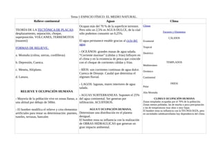 El documento habla sobre el medio natural, incluyendo el relieve continental, las aguas, y el clima. Explica la teoría de la tectónica de placas y cómo esto ha moldeado las diferentes formas de relieve alrededor del mundo. También describe los diferentes tipos de agua como océanos, ríos, lagos y aguas subterráneas, y cómo estas influyen en la distribución de la población humana y la ocupación de la tierra.