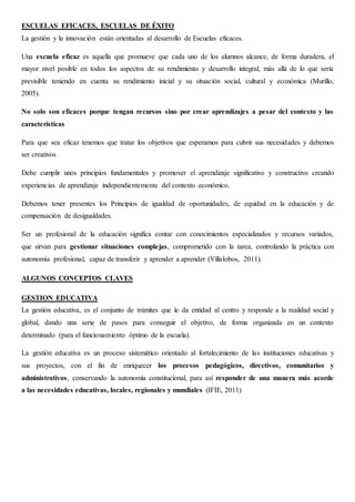 Este documento presenta una introducción a la gestión e innovación educativa en el sistema educativo español desde el marco normativo. Explica que toda acción educativa debe fundamentarse en un marco normativo y contribuir al desarrollo integral del niño. Define conceptos clave como gestión educativa, gestión de aula, innovación educativa y liderazgo. También resume los principales aspectos de la LOE y LOMCE en relación a la gestión, autonomía de los centros, funciones del profesorado e innovación.