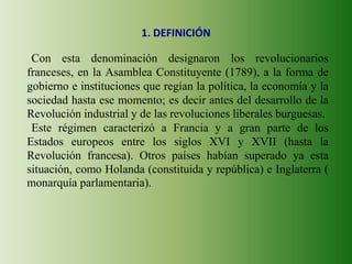 El documento describe las características principales del Antiguo Régimen en Europa entre los siglos XVI y XVIII. El Antiguo Régimen se caracterizó por monarquías absolutas, una sociedad estamental dividida en órdenes y una economía predominantemente agraria. La Ilustración surgió en el siglo XVIII promoviendo el uso de la razón y la crítica para reformar la sociedad y liberar al hombre de las limitaciones impuestas por la tradición.