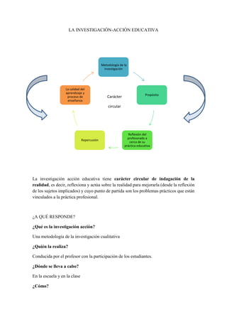 La investigación-acción es un proceso sistemático de reflexión sobre la práctica educativa con el objetivo de mejorarla. Se caracteriza por ser un proceso circular que implica la planificación de una acción educativa, su implementación, observación de resultados y reflexión para mejorar en futuras intervenciones. Tiene como propósito ampliar la comprensión de los docentes sobre sus problemas prácticos y lograr cambios educativos que mejoren el aprendizaje de los estudiantes.