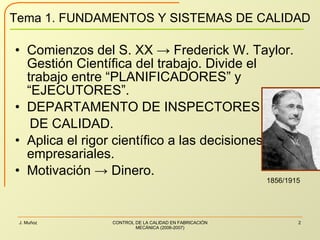El documento describe la evolución de la calidad y el control de calidad a través de la historia. Comenzó con el trueque entre productores y usuarios en las primeras comunidades humanas. Más tarde, surgió la inspección para establecer especificaciones de productos y procesos. En el siglo XX, pioneros como Taylor y Deming desarrollaron enfoques científicos para la gestión y el control de calidad. Estos enfoques evolucionaron hacia la calidad total y los sistemas de gestión de la calidad como ISO 9000.