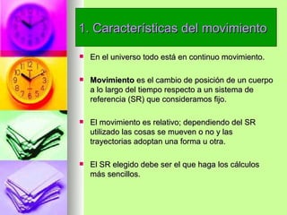1. El documento describe los conceptos básicos de la cinemática, incluyendo el movimiento, trayectorias, magnitudes escalares y vectoriales.
