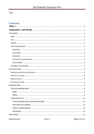 Este documento trata sobre hardware y software. Explica conceptos como placa base, BIOS, memoria RAM, microprocesador, disco duro y periféricos. Describe los componentes de la placa base como el chipset, ranuras de expansión y zócalos. Explica el funcionamiento de la memoria RAM, los tipos de disco duro y la estructura lógica de estos. Por último, define los periféricos y tipos de estos.
