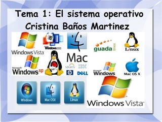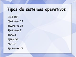 El documento habla sobre los diferentes tipos de sistemas operativos como Windows, Mac OS y UNIX. Explica que un sistema operativo controla y coordina el uso del hardware entre programas y usuarios. Luego describe algunas características básicas de Windows como la barra de tareas, ventanas y herramientas del sistema como el defragmentador de disco y restaurador de sistema. También define conceptos como formatear, reiniciar, apagar y suspender.