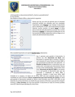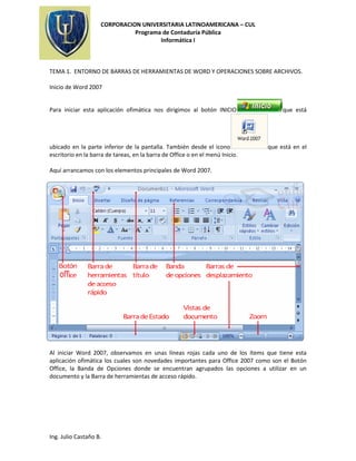 El documento describe las principales características y herramientas de Microsoft Word 2007. Explica cómo iniciar Word 2007 y los elementos clave como la barra de herramientas de acceso rápido y las bandas de opciones. También detalla los pasos para guardar un documento y los diferentes formatos de archivo disponibles, así como las funciones de las cinco bandas de opciones principales en Word 2007.
