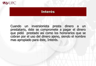 El documento explica los conceptos básicos de interés simple y compuesto. Define interés como la diferencia entre el monto a pagar al final y el capital inicial prestado. Explica que en el interés simple solo se considera el capital inicial para calcular el interés de cada período, mientras que en el interés compuesto el interés ganado en un período se añade al capital para calcular el interés del siguiente período. También proporciona fórmulas para calcular el interés simple e interés compuesto.