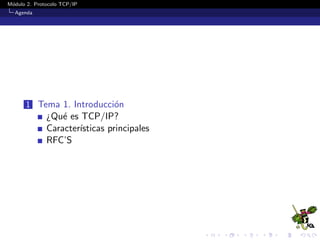 El documento ofrece una introducción al protocolo TCP/IP, explicando su función como un conjunto de protocolos de red que permite la comunicación entre computadoras interconectadas. Se detalla la estructura y características del modelo TCP/IP, incluyendo sus capas de acceso a la red, internet, transporte y aplicación. Además, se mencionan organizaciones responsables de los estándares y la documentación relacionada, como los RFC (Requests for Comments).