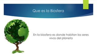 La biosfera es donde habitan los seres vivos en el planeta y se compone de la litosfera, hidrosfera y atmósfera. Se caracteriza por ser un sistema complejo con gran biodiversidad que evoluciona y presenta una desigual distribución de océanos, montañas, continentes y seres vivos, subdividiéndose en biomas, biocenosis y zonas de vida.