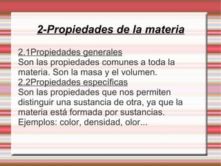 Este documento proporciona una introducción a los conceptos básicos de la materia y las propiedades físicas, incluyendo masa, volumen, longitud, superficie, densidad, temperatura y tiempo. Explica que la materia es todo lo que ocupa espacio y tiene masa, y define las propiedades generales y específicas. Además, describe las unidades del Sistema Internacional (metro, kilogramo, segundo, kelvin) para medir estas propiedades físicas.