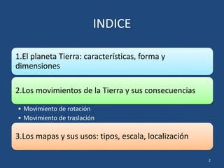 El documento resume los principales conceptos sobre la Tierra. Explica que la Tierra es un planeta del sistema solar situado en la Vía Láctea. Describe los dos movimientos de la Tierra, la rotación y la traslación, y sus consecuencias como la sucesión del día y la noche, las estaciones y los husos horarios. También define los mapas, sus elementos como meridianos, paralelos y escala para localizar puntos en la superficie terrestre.
