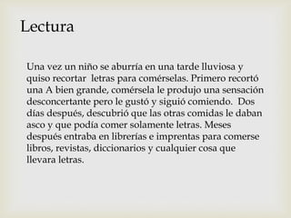 El niño se aburría en una tarde lluviosa y comenzó a comer letras recortadas de papel. Descubrió que le gustaba comer letras y que era lo único que podía comer. Meses después solo comía libros, revistas y otros materiales impresos para ingerir letras.
