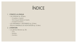 Este documento presenta información sobre el tema de lengua y literatura. Brevemente describe las diferentes lenguas habladas en España, incluyendo el castellano, y explica los principales géneros literarios como lírico, narrativo y dramático, dando ejemplos de cada uno. También incluye una sección sobre acentuación y normas generales de la lengua castellana.