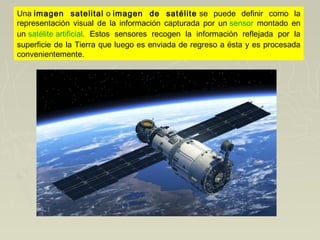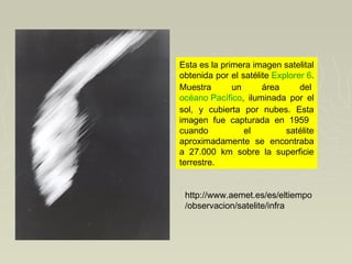 Este documento describe las imágenes satelitales y su proceso de captura y procesamiento. Muestra la primera imagen satelital obtenida por el satélite Explorer 6 en 1959, que mostraba un área del océano Pacífico iluminada por el sol y cubierta por nubes desde una altitud de aproximadamente 27.000 km. También explica que la fotografía aérea analiza la superficie terrestre mediante el uso de cámaras instaladas en aeronaves.