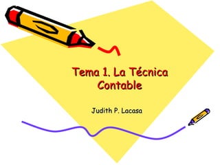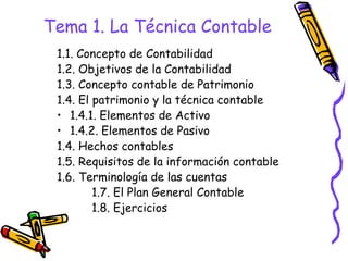 El documento trata sobre los conceptos básicos de la técnica contable. Explica que la contabilidad representa la realidad económica y financiera de una empresa mediante el registro de sus operaciones. Define el patrimonio de una empresa como el conjunto de sus bienes, derechos y obligaciones, y explica cómo se clasifican estos elementos en las masas de activo, pasivo y neto patrimonial. Por último, describe los principios de la contabilidad de partida doble y cómo se registran los hechos contables afectando al menos dos cuentas, una en debe