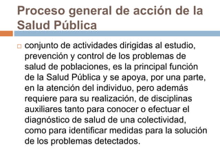 El documento describe el proceso general de acción en salud pública, incluyendo el diagnóstico colectivo de salud de una población. Explica que el diagnóstico colectivo permite conocer la situación de salud de una población a través de la morbilidad, mortalidad y factores que afectan la salud. Además, detalla las cinco etapas para elaborar un diagnóstico colectivo: descripción, análisis, identificación de prioridades, evaluación y pronóstico. Finalmente, introduce conceptos básicos de