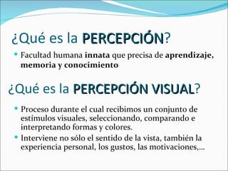 La percepción visual es el proceso mediante el cual recibimos estímulos visuales y los interpretamos. Involucra la luz, los colores, las formas, las texturas, la profundidad y la dinámica espacial. La organización del campo visual y las constantes perceptuales nos permiten distinguir figura y fondo. La comunicación visual transmite mensajes a través de imágenes usando códigos visuales.