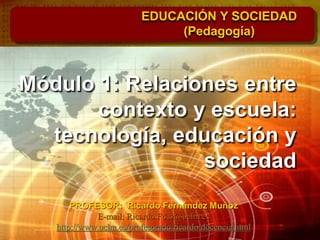 Este documento presenta información sobre las relaciones entre la educación, la tecnología y la sociedad. Explica cómo la sociedad ha evolucionado de una sociedad de la información a una sociedad del conocimiento debido a los avances tecnológicos. También describe el papel cambiante de la escuela en este contexto y las competencias clave que los estudiantes deben desarrollar, incluida la competencia digital. Finalmente, analiza los usos positivos y negativos de las tecnologías de la información y la comunicación en la educación.