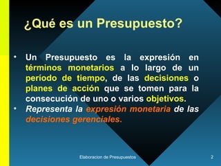 El documento habla sobre los conceptos generales de la elaboración de presupuestos. Explica que un presupuesto es la expresión monetaria de los planes y objetivos de una organización a lo largo de un período de tiempo. También describe las funciones de un presupuesto como la planeación, organización, dirección y control, así como los diferentes tipos de presupuestos como los de operación, financieros y los enfoques tradicionales, por centros de responsabilidad y base cero. Finalmente, explica el proceso de planeación y los niveles de responsabilidad