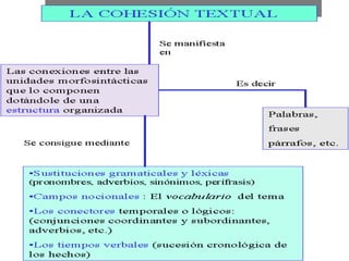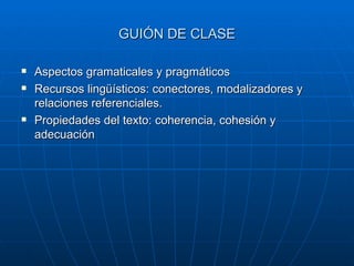 GUIÓN DE CLASEAspectos gramaticales y pragmáticos Recursos lingüísticos: conectores, modalizadores y relaciones referenciales. Propiedades del texto: coherencia, cohesión y adecuación